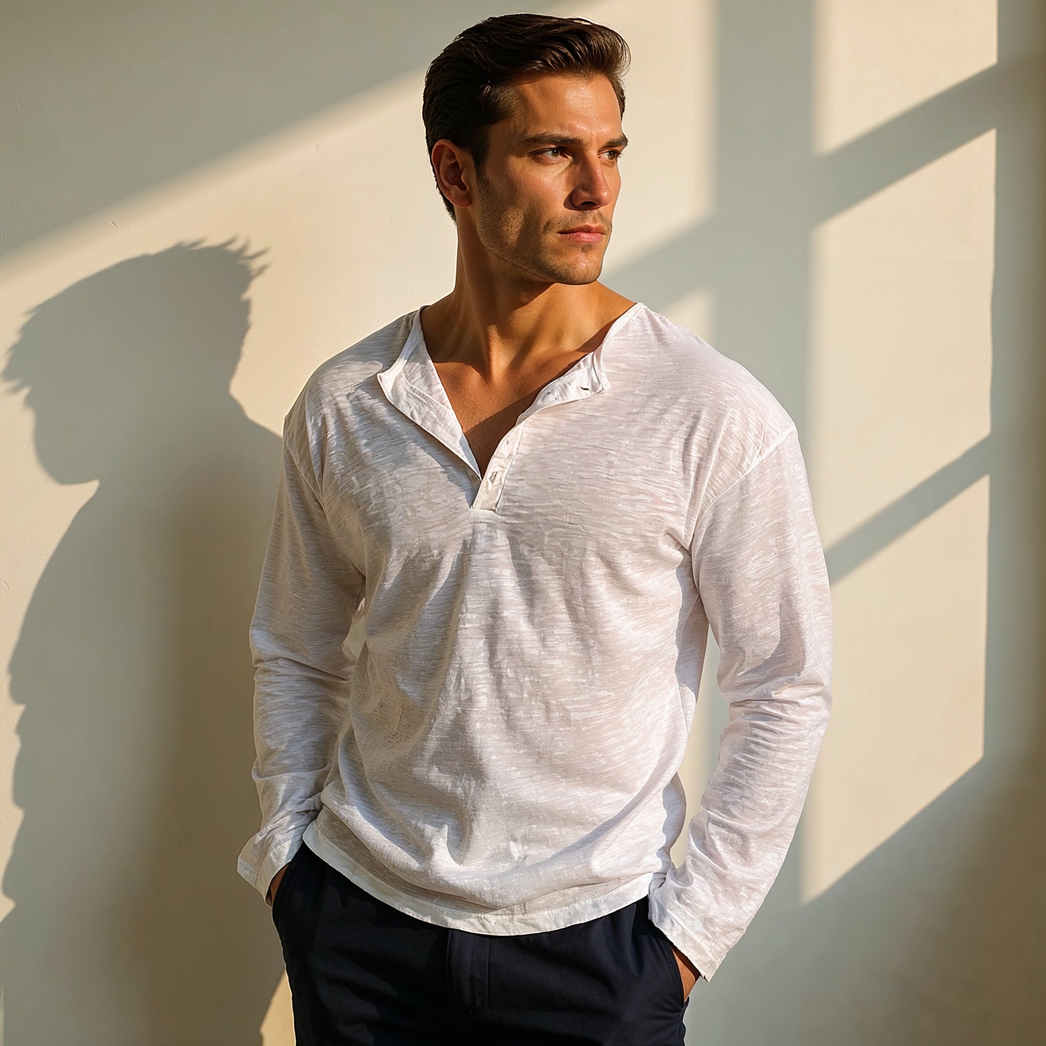 Created from high-quality cotton, this lightweight, finely textured long sleeve V-neck T-shirt is perfect for a relaxed summer look.